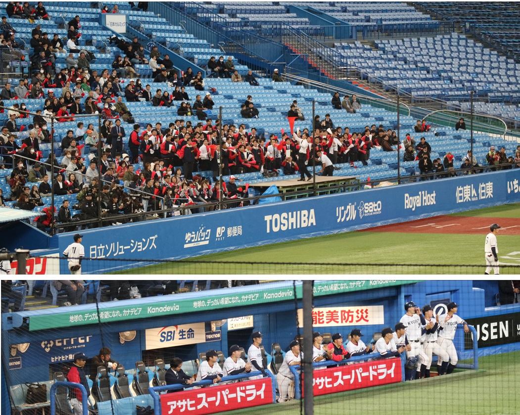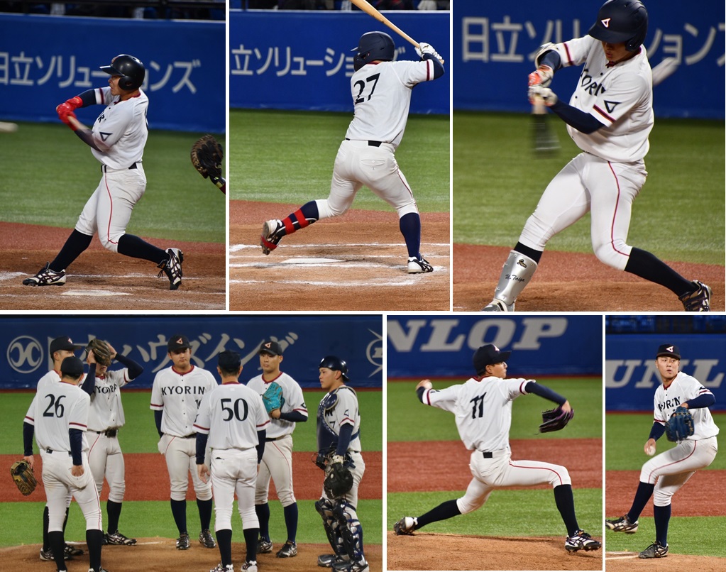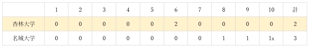 試合は両投手の投げ合いと野手の堅い守りで5回まで「0」が並ぶ緊迫した展開が続きました。6回表に杏林大学が均衡を破り2点をあげ、このまま一気に振り切るかと思いきや、名城大学が8回、9回に1点ずつ加点し、勝負はタイブレークへと持ち越されました。10回表に得点できなかった杏林大学に対し、名城大学は勝利を決める長打を放ち、熱戦に終止符を打ちました。