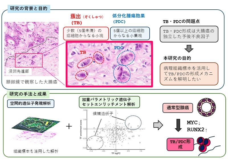 本研究の成果は、大腸癌が浸潤する際に、MYCの低下とRUNX2の上昇という転写制御の変化によってTB/PDCという形態を示しながら浸潤能力を獲得する仕組みが働いている可能性を示したものです。これらの知見は、大腸がんの進展メカニズムの理解を深めるとともに、将来的な治療標的の開発につながることが期待されます。