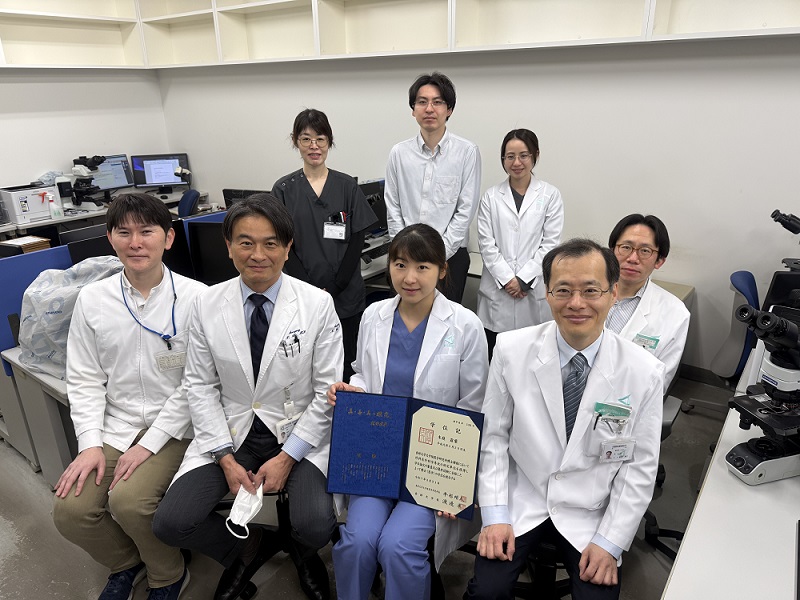 木庭医師は「柴原教授、阿部教授、林准教授、日比谷助教をはじめ、病理学教室の皆様の温かいご指導のおかげと心より感謝申し上げます。この貴重な経験を糧に、今後の臨床に活かしていきたいと思います。」、指導した林准教授は「小さいお子さんのお世話をしながら最後までよく頑張ってくれました。今後もぜひ臨床の色々な疑問に研究の面からもアプローチしてください」とのことです。