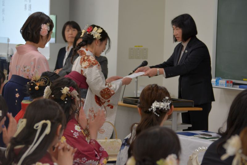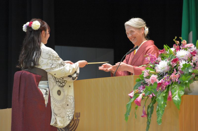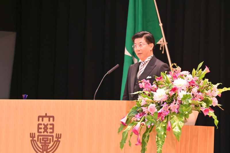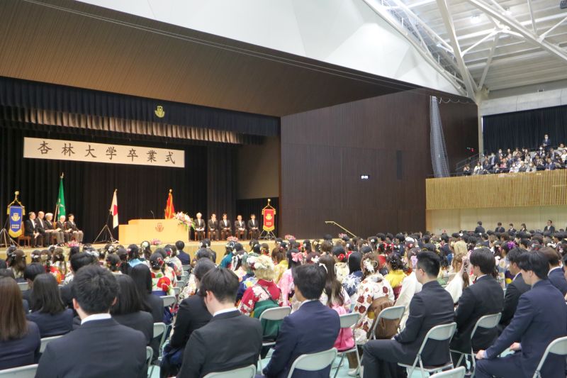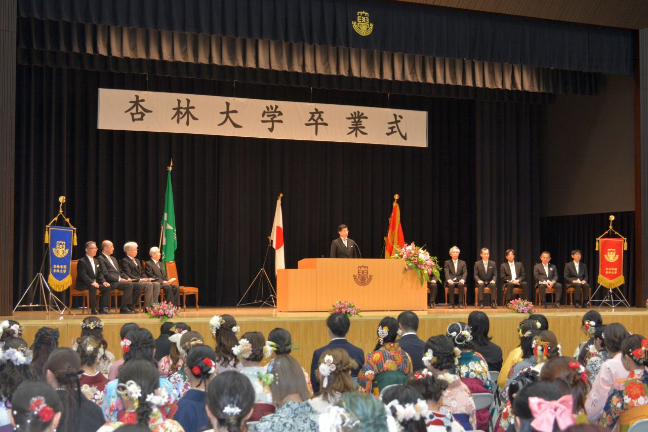 式辞に立った渡邊卓学長は、杏林の故事を紹介しながら、「人として困っている人に目を向けること、手を差し伸べることの大切さを意味しています。これから社会人となるみなさんは杏林の卒業生として、この教えを心がけて行ってほしい」と卒業生へ励ましの言葉を送りました。松田剛明理事長からは、「未来を切り開くのは一人ひとりの熱い思いとの行動力、困難に直面したときに諦めない不屈の精神、この力こそが成功へとつながる原動力になります。大きな夢を持ち、理想を掲げ、一歩を踏み出してください」と力強い祝辞が述べられました。
