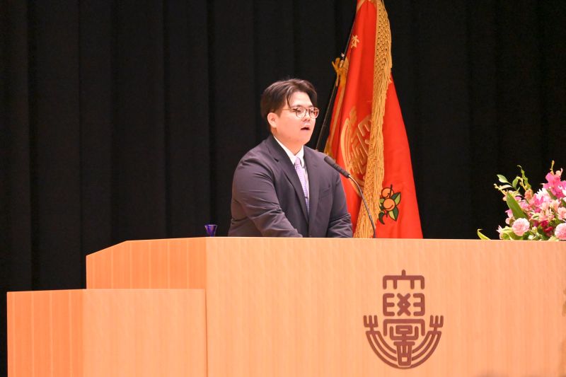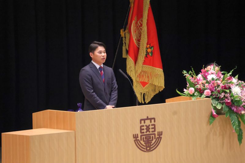 続く卒業生代表スピーチでは、午前の部で保健学部の鈴木悠太さんが登壇し、4年間の硬式野球部での経験を振り返りました。「挑戦する勇気や仲間を信じる力、そして多くの方への感謝を学びました」と語り、社会へ踏み出す決意を新たにしました。午後の部では、外国語学部の高場太一さんが在学中の台湾留学に触れ、言葉が通じず悔しい思いをしながらも学び続け、世界の仲間と交流できるまで成長した経験を語り、「挑戦を続ければ、想像を超える未来に出会えることを学びました」と感謝の気持ちとともに締めくくりました。