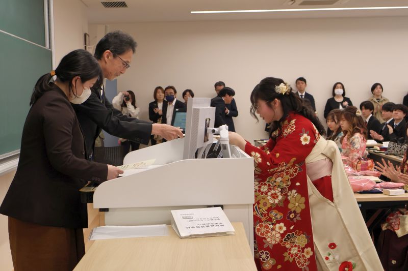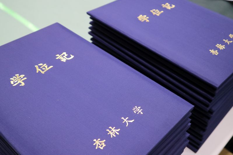 式の最後には、杏林大学吹奏楽団がオリジナル曲「アプリコットマーチ」を演奏し、華やかに式典を彩りました。終了後は、各学部・学科に分かれ、卒業生一人ひとりへ学位記が手渡されました。