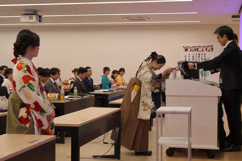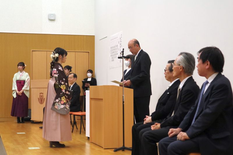 今年の卒業生・修了生は、医学部101名、保健学部666名、総合政策学部229名、外国語学部259名、大学院69名でした。式では最初に学位記が代表者へ授与され、続いて学業や活動で優れた成果を収めた学生に学園長・学長賞が贈られました。