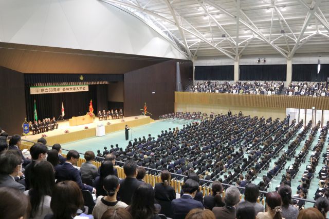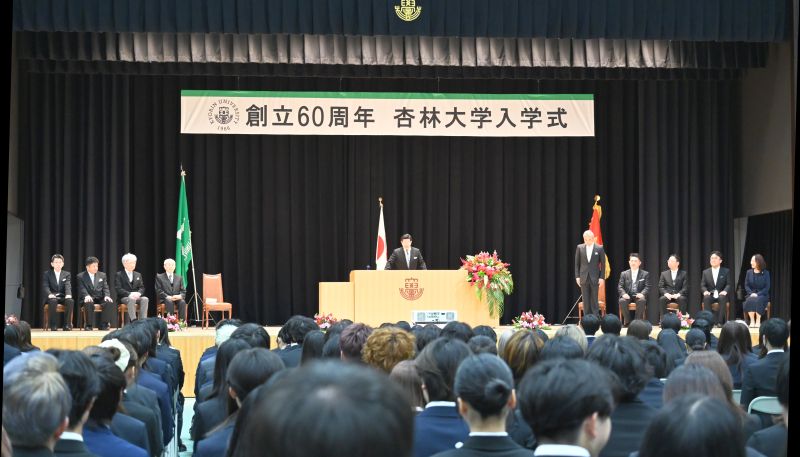 令和8年4月5日、創立60周年杏林大学入学式が、三鷹キャンパスで午前・午後の2回に分けて行われました。今年度の新入生は、医学部116名、保健学部834名、総合政策学部268名(うち編入・転入学10名)、外国語学部278名(うち編入・転入学14名)、医学研究科12名、保健学研究科35名、国際協力研究科14名の、計1,557名です。