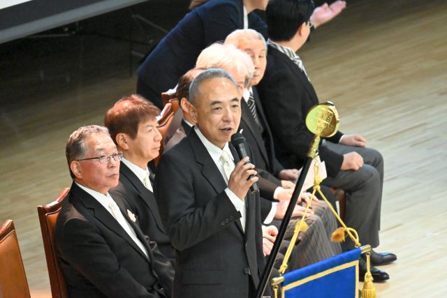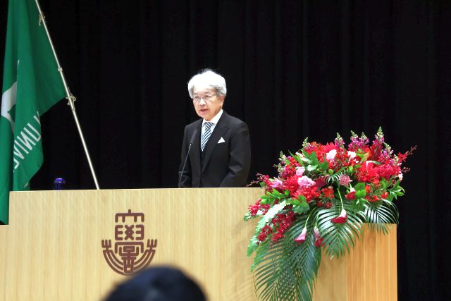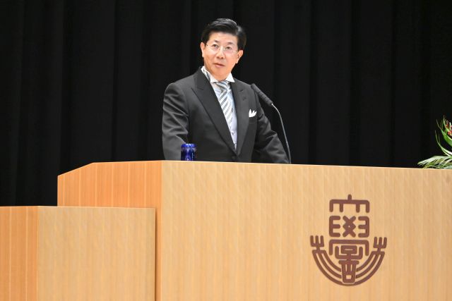 続いて、松田 剛明学園長・理事長からは、広く世界へ目を向けること、学業だけでなく課外活動にも積極的に取り組むこと、そして自らのオリジナリティを確立することへの期待が述べられました。また留学をはじめとする国際的な学びの機会や、スポーツ・文化活動を通じた人間的成長の重要性についても言及し、新入生へ力強いエールを送りました。