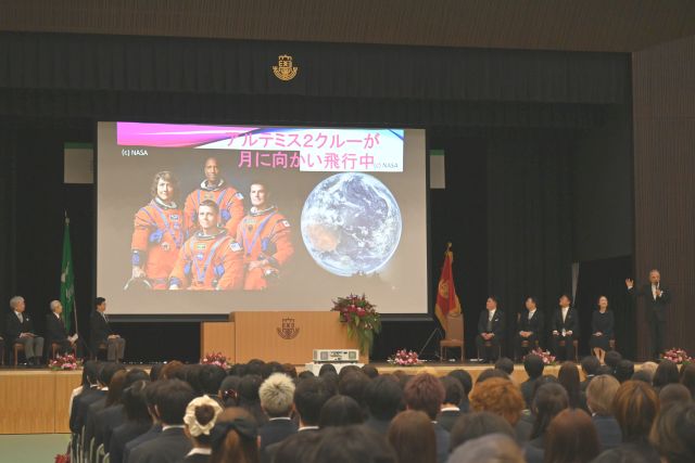 式典の終わりには今年4月に杏林大学医学部に着任した元JAXA宇宙飛行士、古川聡特任教授による記念講演が行われました。国際宇宙ステーションでの滞在経験に触れながら、常識を疑い挑戦する姿勢についての講演は、新入生に大きな夢を与えました。
