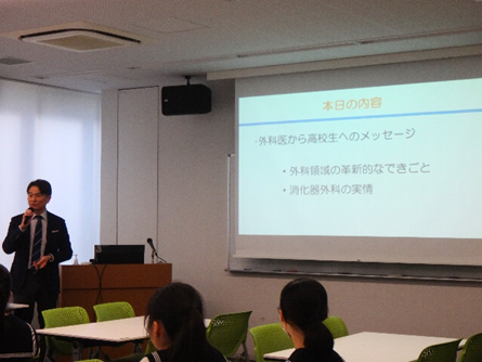 医学部と保健学部看護学科の合同講義では、医学部消化器外科学の阿部先生、医学教育学教室の江頭先生、保健学部看護学科の中島先生、勝又先生が登壇しました。