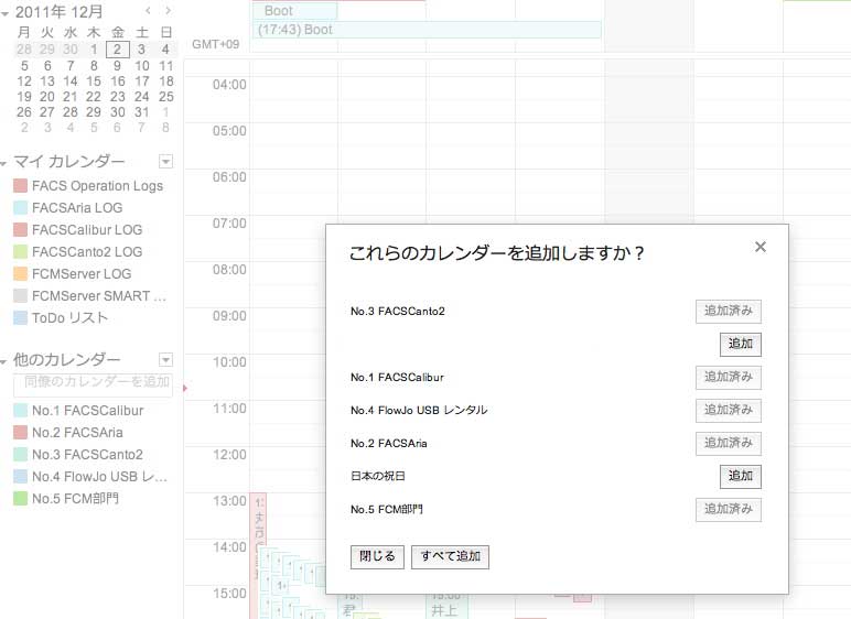 - Googleカレンダーウィンドウが自動的に、開き「これらのカレンダーを追加しますか?」というダイアログが表示されるので「すべて追加」を押して下さい(図は多少異なる場合があります)。