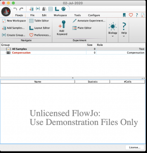 1. FlowJo (Ver 10.x)を立ち上げ、メインウィンドウ右下の「Licence…」をクリックする。